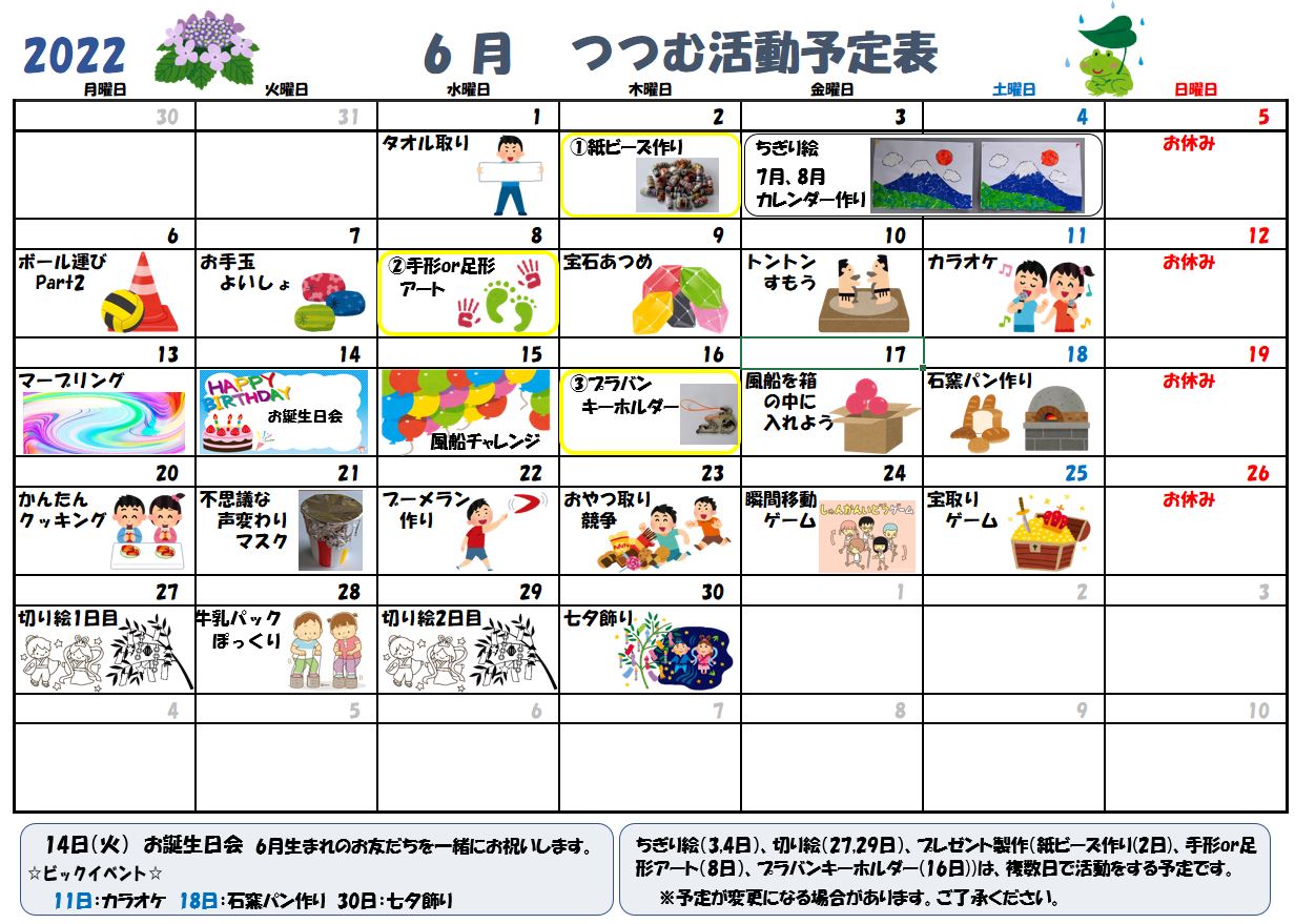 梅雨に入りますので、室内での運動系、製作系の活動を増やしています。毎月のお誕生日会も楽しみの一つです。実際の活動の中で子どもたちが個々に自己の成長を感じられるように取り組んでいます。