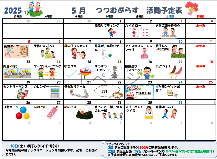 今月は、母の日のプレゼントや手作りすごろくを作ります。他にも、運動、料理、感覚遊びなど様々な活動を行っていきます。