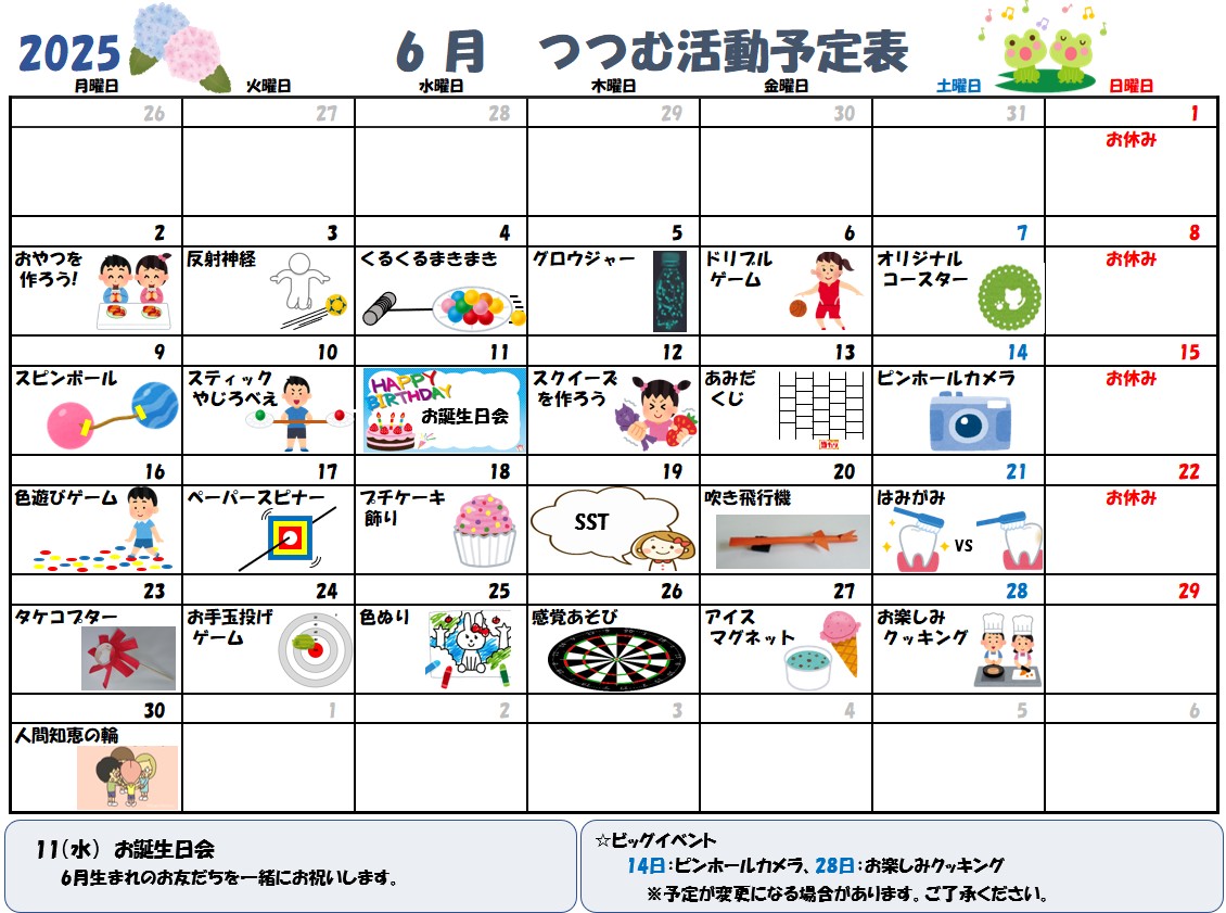 今月は、室内の活動をメインにしています。お誕生日会を始め、プレゼント作りなどの制作系、運動系、料理系などさまざまな活動を行っていきます。