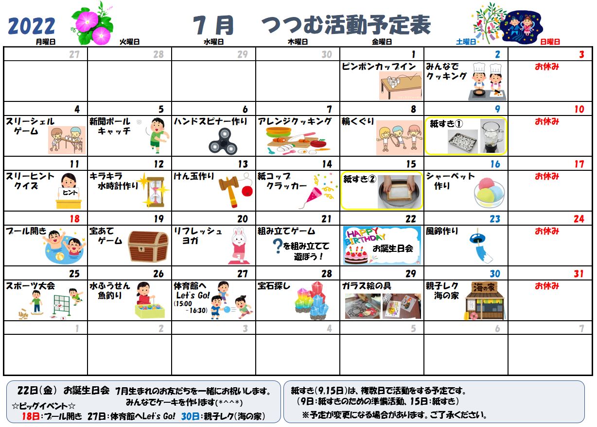 7月の活動予定です。 (予定であり、変更が発生する場合があります。) 梅雨が明けました。今月は親子レクレーションで海...