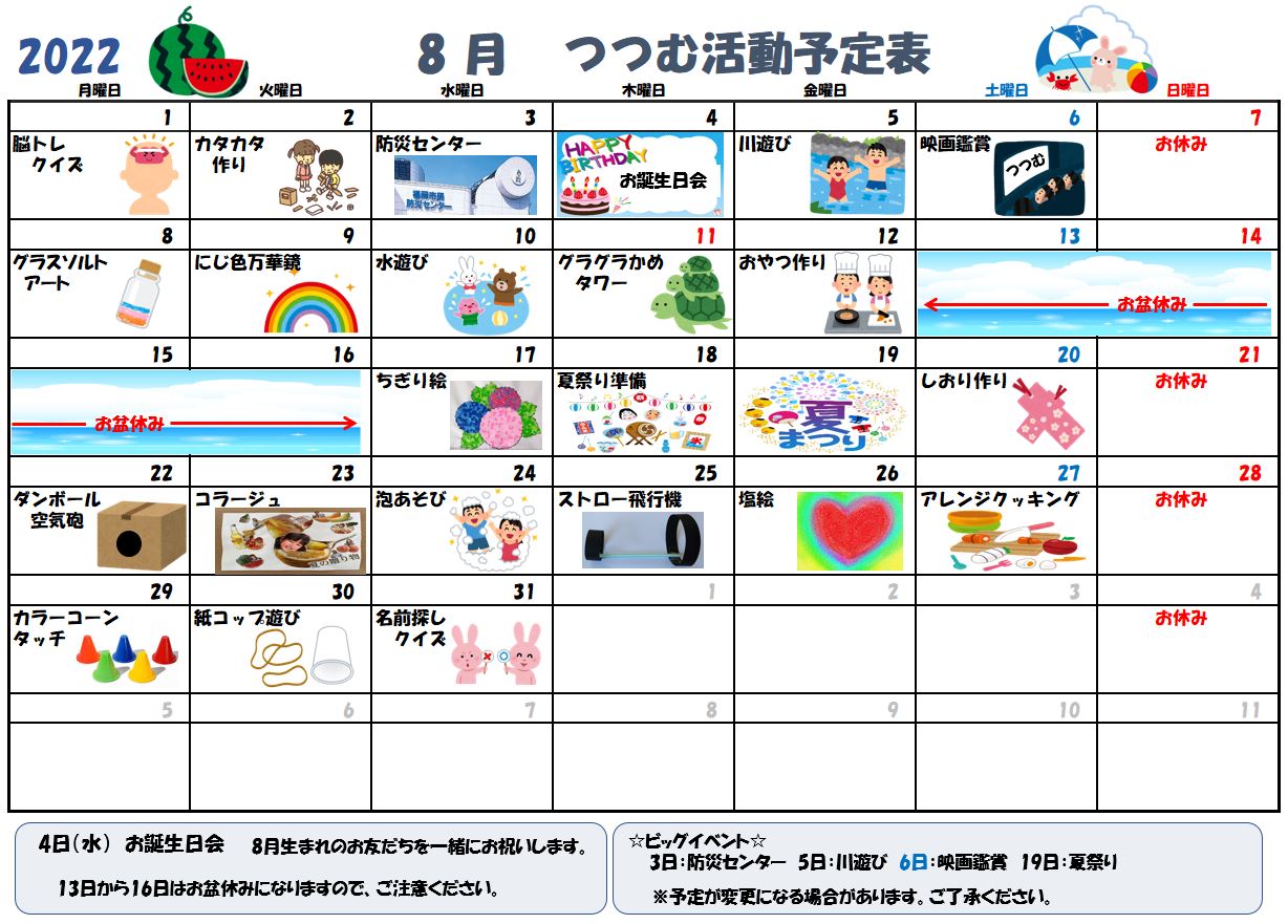 8月の活動予定です。 (予定であり、変更が発生する場合があります。13日から16日はお盆休みとなります。) 夏休みの...