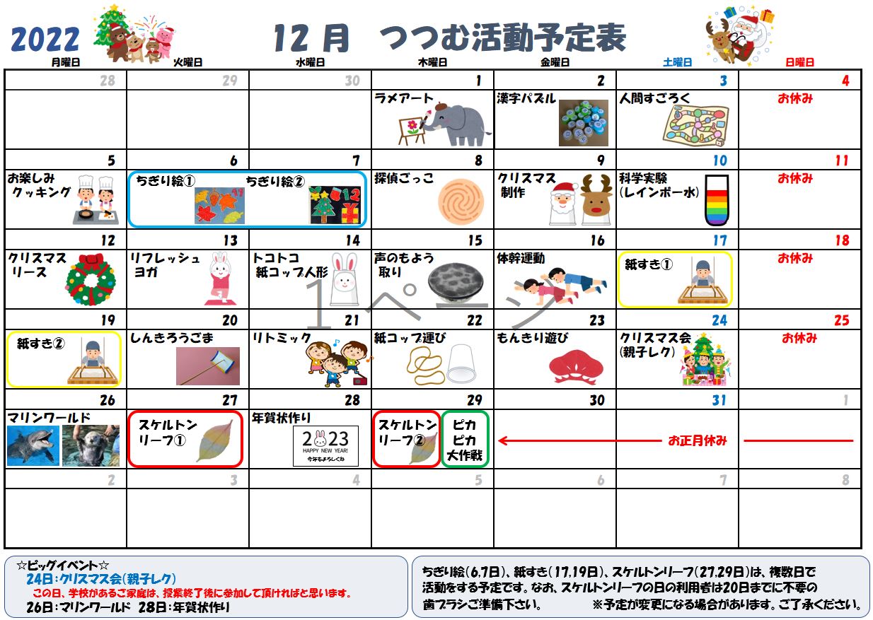 12月の活動予定です。 (予定であり、変更が発生する場合があります。) 今年も最後の月になりました。 今月は、親子...