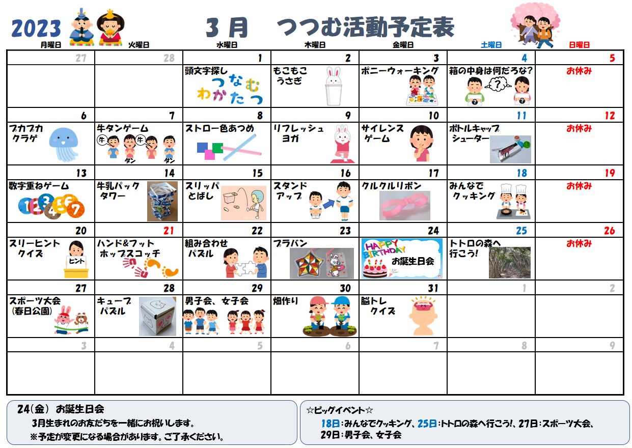 3月の活動予定です。 (予定であり、変更が発生する場合があります。) 春休みがあるので一日の活動を多く取り入れていま...