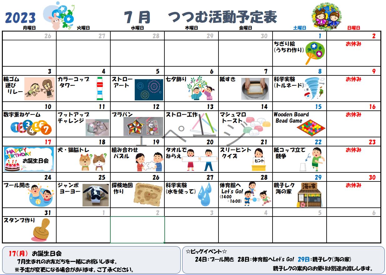 7月の活動予定です。 (予定であり、変更が発生する場合があります。) まだまだ、ジメジメした日が続きますね。職員含め...