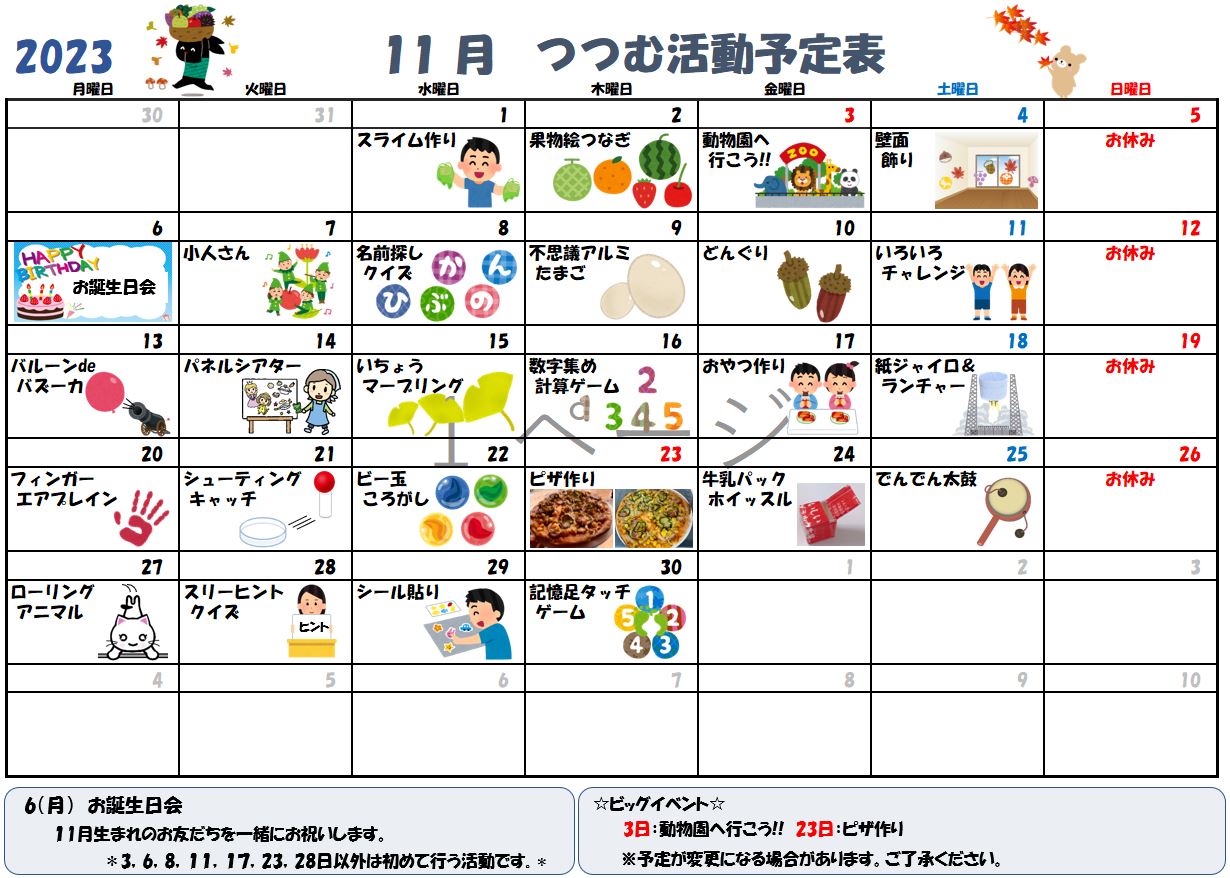 11月の活動予定です。 (予定であり、変更が発生する場合があります。) 今年は暑い日が続き、寒暖差が大きいので、子ど...