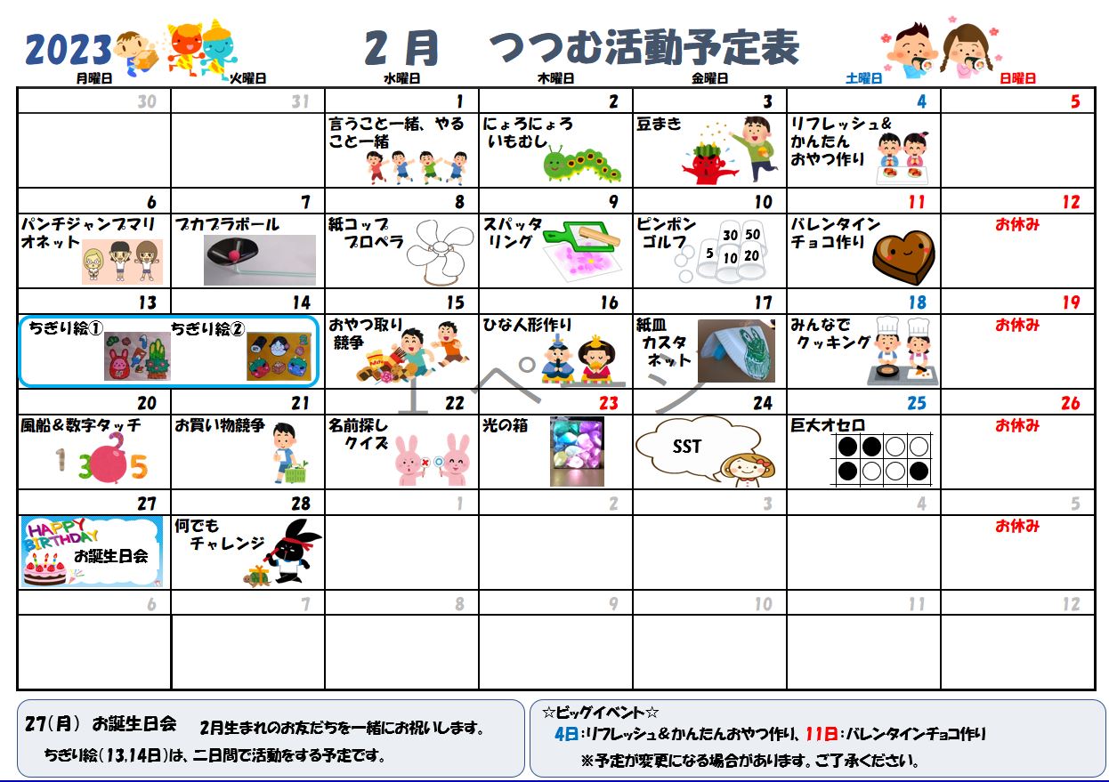 2月の活動予定です。 (予定であり、変更が発生する場合があります。) 豆まきやひな人形作りのような季節感を大事にした...