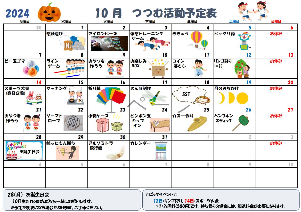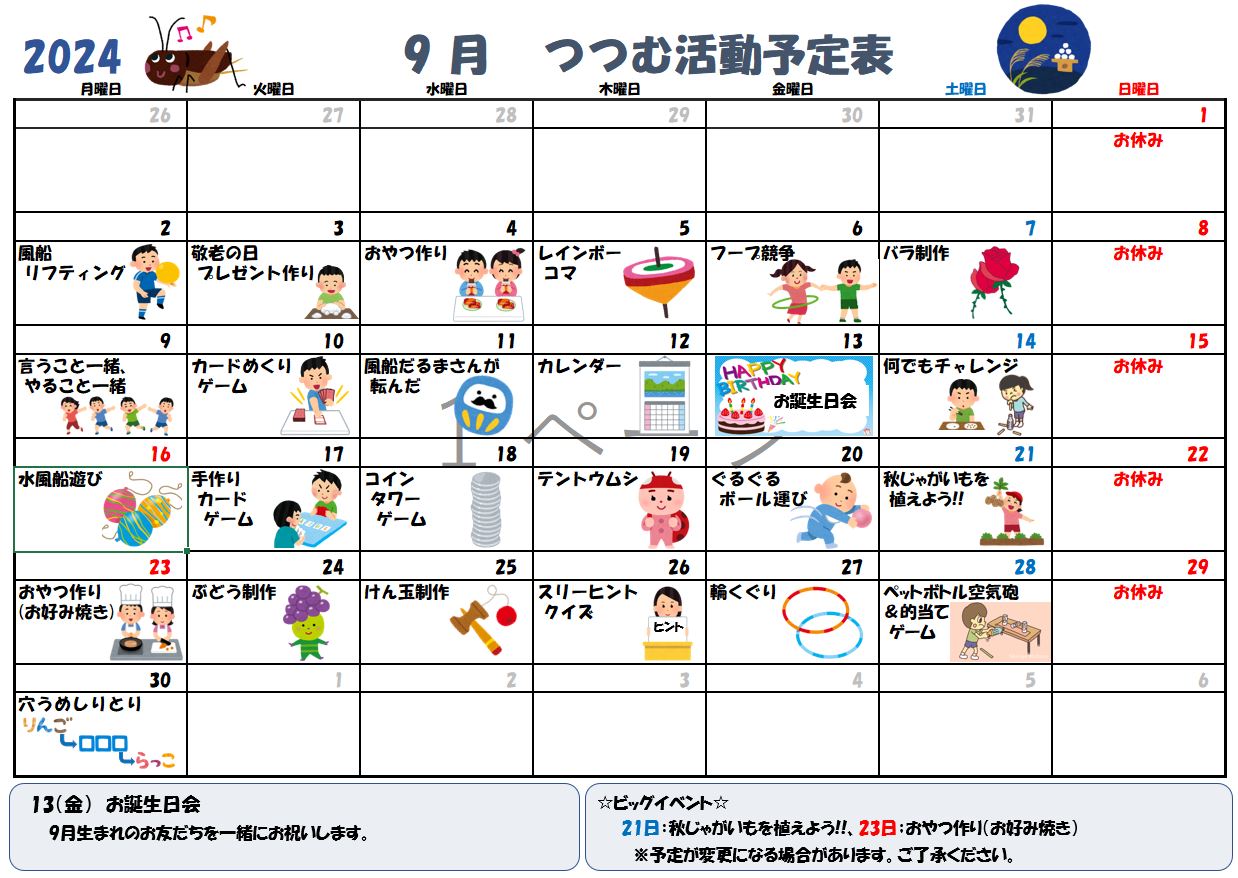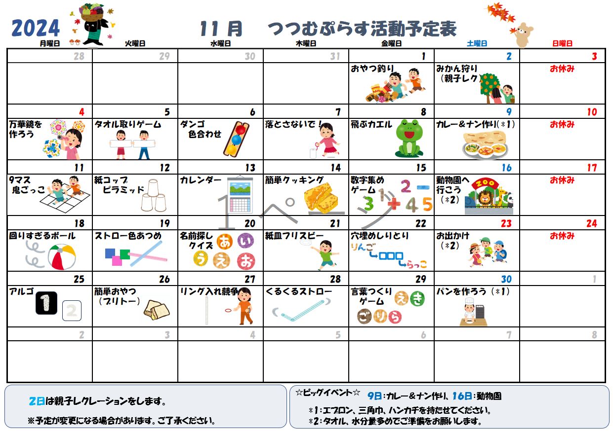 つつむぷらすの11月の活動予定です。 残暑も終わり朝晩はめっきり寒くなってきました。学校行事では運動会も終わり冬支度が...