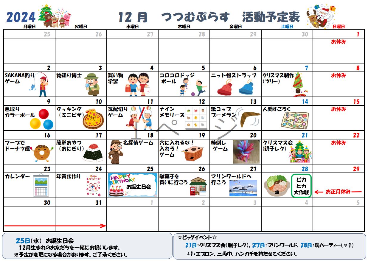 つつむの令和6年12月の活動予定です。 (予定であり、変更が発生する場合があります。) やっと寒くなってきたと思えば...