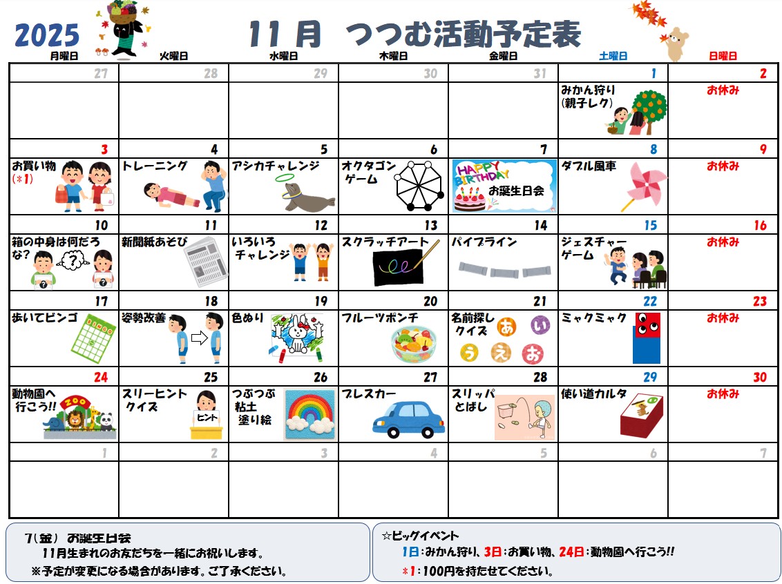 つつむの令和7年11月の活動予定です。 (予定であり、変更が発生する場合があります。) 急に朝晩は寒くなり、一気に秋...