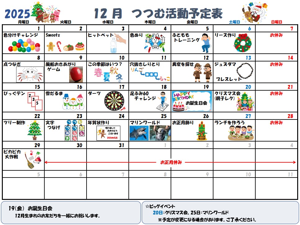 つつむの令和7年12月の活動予定です。 (予定であり、変更が発生する場合があります。) 早いもので令和7年も最終月に...