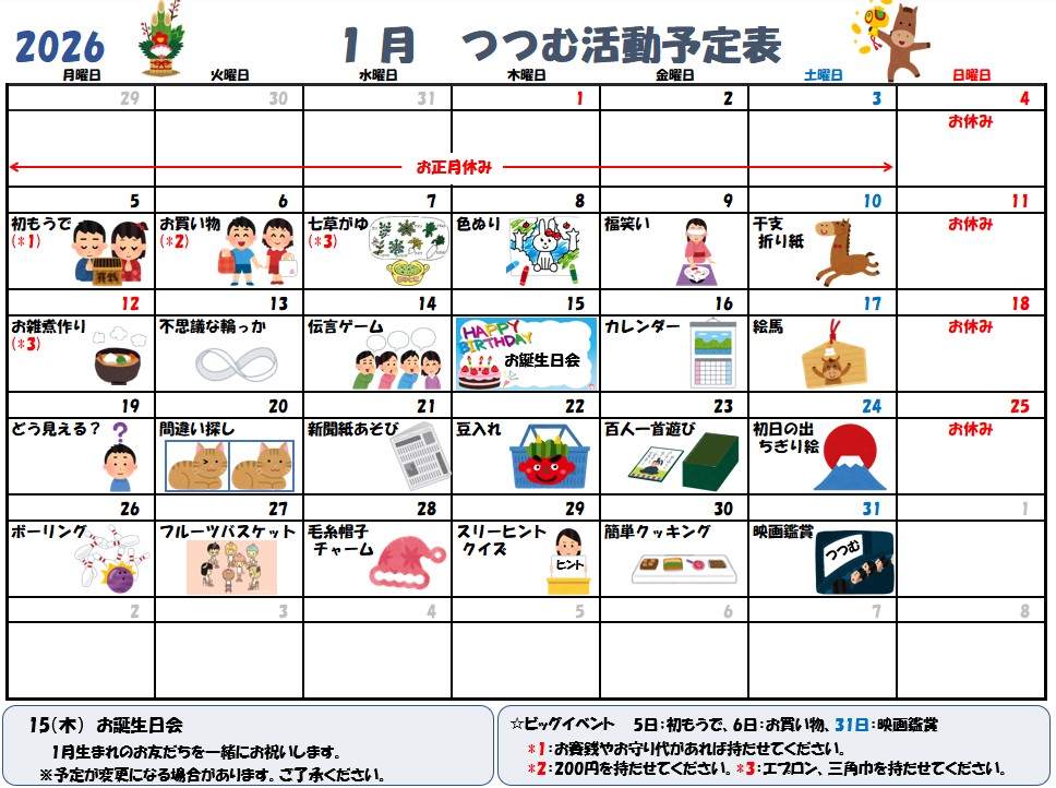 つつむの令和8年1月の活動予定です。 (予定であり、変更が発生する場合があります。) 明けましておめでとうございます...
